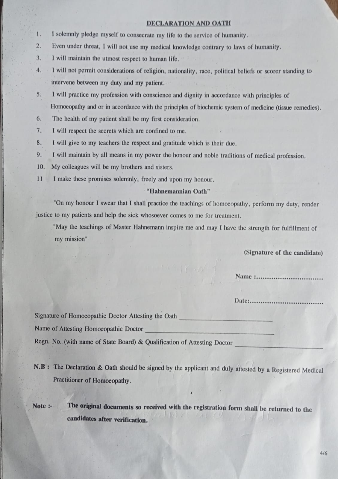 1. Affidavit duly attested by first class Judicial Magistrate (Affidavit Format) (New Application) -(Annexure-“A”) 2. Affidavit duly attested by first class Judicial Magistrate (Affidavit Format) (Renewal) -(Annexure-“A”) 3. Verification of Documents-Form (Format)- (Annexure-“B”) 4. Declaration And Oath (Format).Click to Download 5. Passport Size Photographs 6. Xerox of Degree Certificate 7. Xerox of 1st year Marks Card/ Certificate 8. Xerox of 2nd year Marks Card/ Certificate 9. Xerox of 3rd year Marks Card/ Certificate 10. Xerox of 4th year Marks Card/ Certificate 11. Xerox of Internship Completion Certificate 12. Xerox of College Leaving Certificate duly attested by Principal 13. Xerox of Matric Marks Card/ Diploma 14. Xerox of Secondary School Marks Card 15. Xerox of Provisional Certificate 16. Xerox of Character Certificate of Concerned College 17. Xerox of EMail Id/Contact Number of the Applicant 18. Xerox of Domicile Certificate of UT(J&K) 19. Xerox of Migration Certificate 20. Xerox of Aadhar Card 21. Passsport size latest Photograph(08 Nos) and Stamp-size (04 Nos for IC) 21. HPR(ABDM) I'd No.(Compulsory) Verification Report: Issuing of Registration is subject to the condition of verification and authentication of requisite documents from the concerned Institution/University etc. Note/Instruction: After the successful Online Registration, All the above mentioned requisite/relevant documents shall be produced in original alongwith the Applicant (in-person) before issuing of the formal Registration by the Registrar of the Board. |